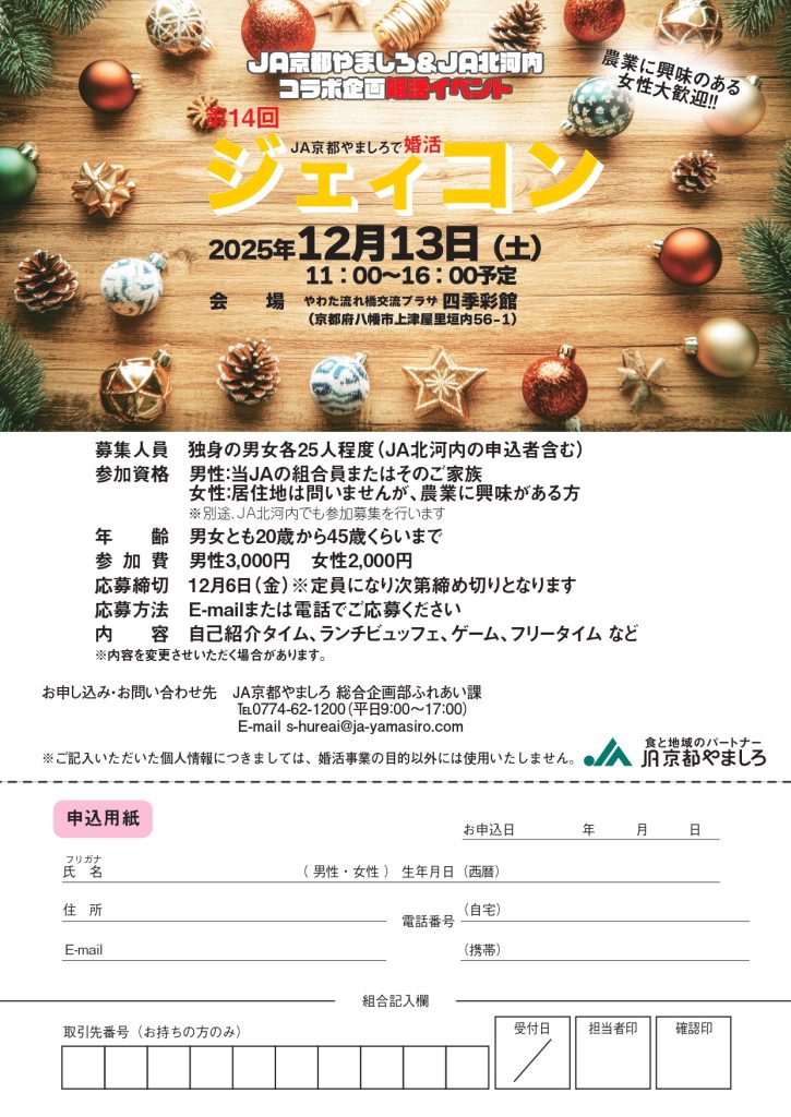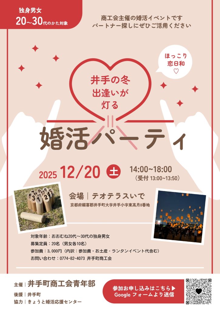 イベント一覧 受付中 2025.12.13 開催 重要文化財が引き合せる 歴史散策婚活 in 旧三上家住宅 受付中 2025.11.29 開催 【募集期間延長!!】恋竹林~クリスマスをカップルで過ごしたい方のための恋活イベント~ 受付中 2025.11.22 開催 【募集期間延長!!】婚活in京丹波 ~出会いは打ちたて、愛はできたて。~ 受付中 2025.12.13 開催 第14回ジェイコン ~JA京都やましろ&JA北河内 コラボ企画婚活イベント~ 受付中 2025.12.07 開催 ★女性のみ追加募集!!★【京都 茶源郷和束】~「いいとこ和束」婚活イベント~ 受付中 2025.12.20 開催 「井手の冬、出逢いが灯る♡」~ほっこり恋日和~ 受付中 2025.11.30 開催 女性限定セミナー『婚活アップ講座』〜初対面の婚活会話術〜 受付中 2025.12.21 開催 クリスマス婚活パーティ 受付中 2025.12.20 開催 京の都恋プロジェクト in 嵐山 受付中 2025.12.21 開催 クリスマス恋活ランチ🍎Apple会 受付中 2025.11.30 開催 ビタースイート婚活in赤れんが ~コーヒー&ショコラでつながるひととき~ 受付終了 2025.11.23 開催 「よさこい」~与謝野で謎解きバスの旅~ 1 2 … 31