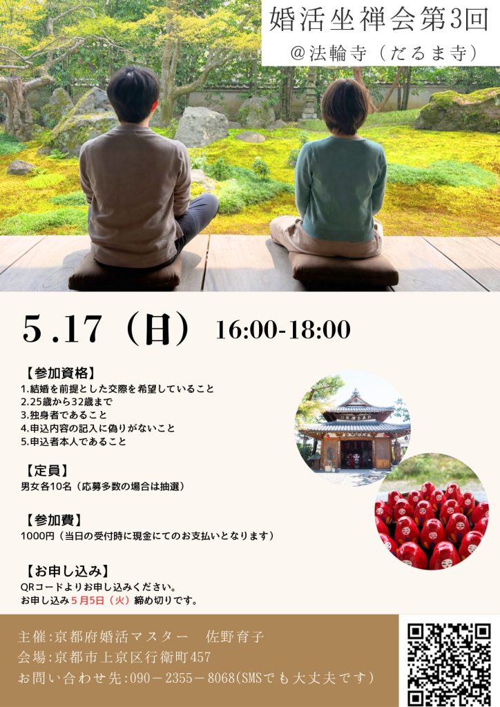 イベント一覧 受付中 2026.05.17 開催 第3回 静かな禅寺で婚活坐禅会 ~ご縁を結ぶひととき~ 受付中 2026.04.26 開催 U36限定。初めての方にも“ちょうどいい”、交流会(第25回) 受付中 2026.04.12 開催 サルサde婚活 受付中 2026.04.18 開催 《女性のみ追加募集中!! 募集締切:4/10(金)まで延長!》【京都 茶源郷和束】~「いいとこ和束」婚活イベント~ 終 了 2026.03.20 開催 【40代限定】自然に出会う、おとな婚 ~ブルーベリーとハーブに癒されて~ 終 了 2026.03.22 開催 U36限定。初めての方にも“ちょうどいい”、交流会(第24回) 終 了 2026.03.15 開催 【 女性のみ追加募集中!!募集締切:3/8(日)まで延長】第2回マッチング大作戦 終 了 2026.03.14 開催 【 女性のみ追加募集中!! 募集締切:2/27(金)まで延長】White Day 婚活 in 舞鶴ふるるファーム (後援:京都府・京都市) 終 了 2026.03.07 開催 【 女性のみ追加募集中!!募集締切:2/28(土)まで延長】和紙作りと共に出会いも重なる『ものづくり体験婚活 黒谷和紙編』 終 了 2026.03.07 開催 会員登録会 in 海の京都(綾部市) 終 了 2026.03.08 開催 男性限定セミナー『婚活アップ講座』交際から成婚へ 〜成婚ロードマップ〜 終 了 2026.03.14 開催 ハンナリーズを一緒に応援しよう! 1 2 … 33